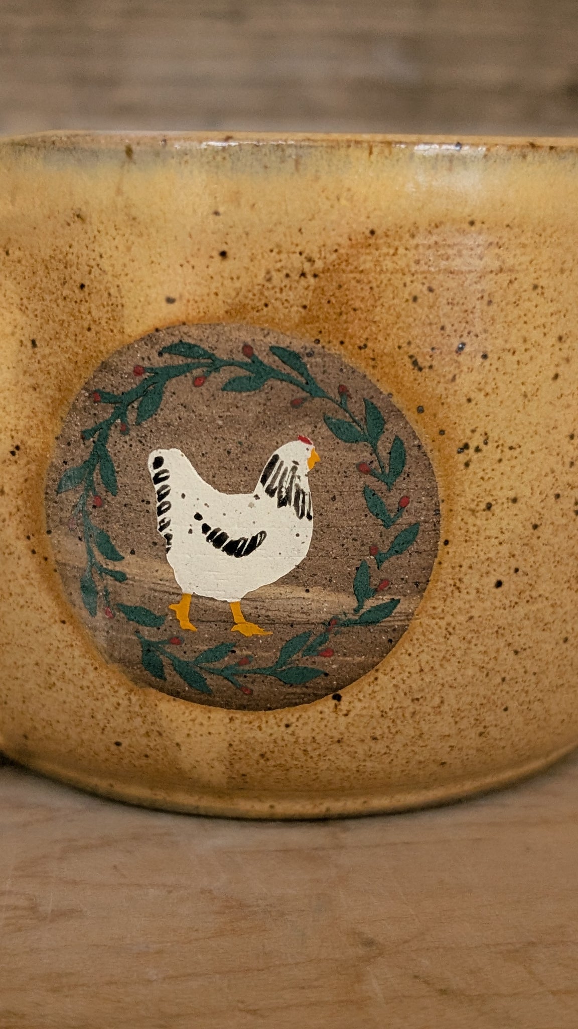 Beautiful hand thrown stoneware mug. Hand painted chicken.