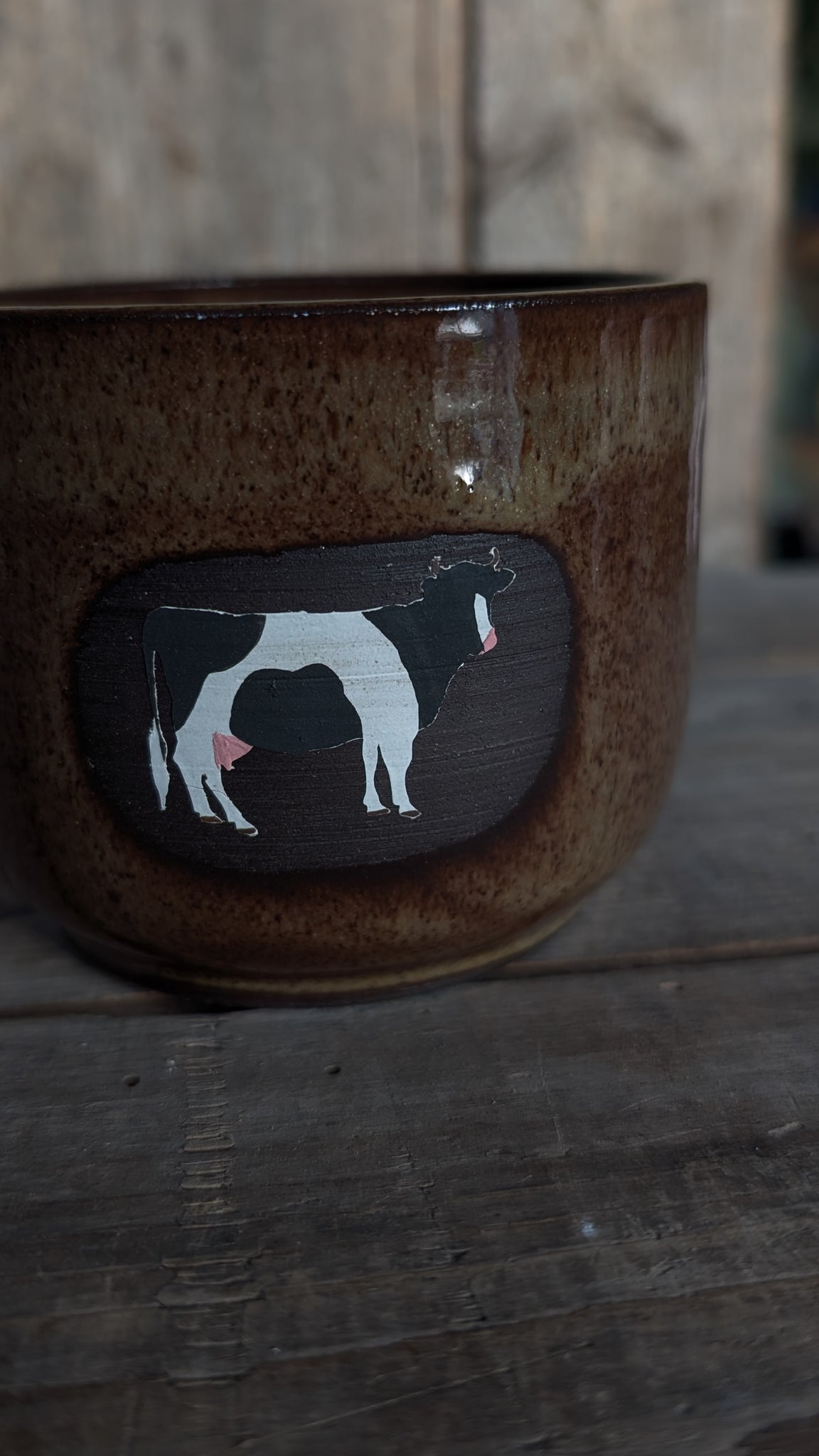 Magnifique tasse en grès tourné à la main. Vache holstein peint à la main.