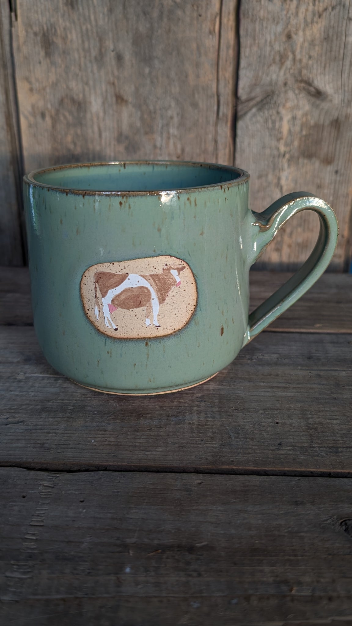 Beautiful hand thrown stoneware mug. Hand painted ayrshire cow.