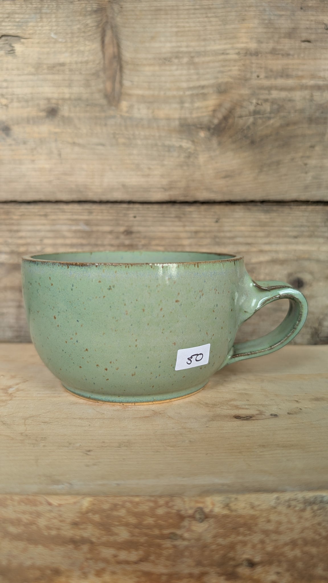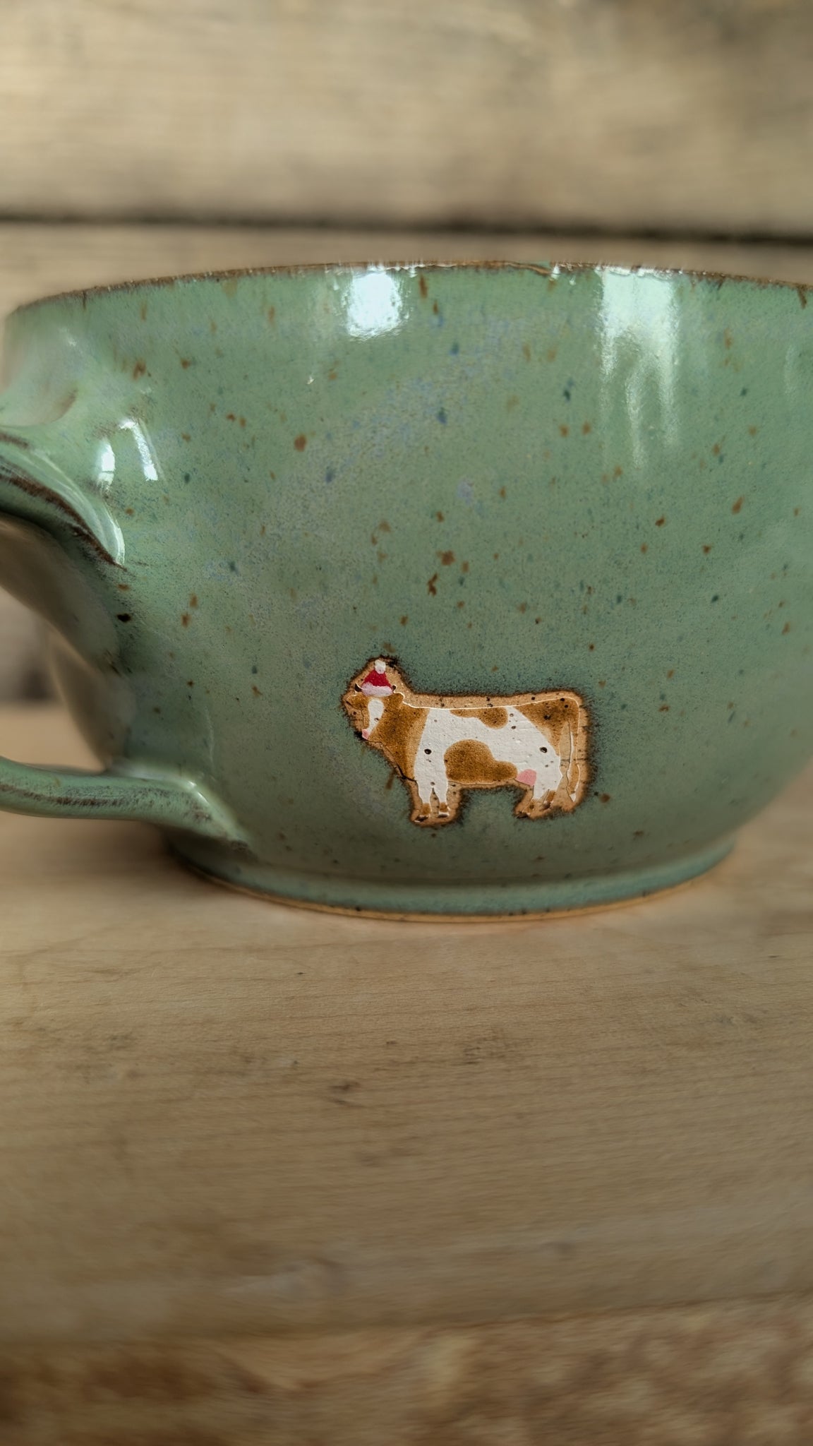 Magnifique tasse en grès tourné à la main. Vache ayrshire peint à la main.